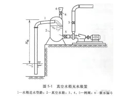 用水泵真空引水裝置充水時(shí),先打開閘閥3、4、5,從漏斗6向水箱2中灌水至水箱進(jìn)水管路下緣齊平后,關(guān)閉閘閥3和4,即可啟動(dòng)水泵。水泵啟動(dòng)后,打開閘閥3,水箱中水位下降,齊平后,關(guān)閉閘閥3和4,即可啟動(dòng)水泵。水泵啟動(dòng)后,打開閘閥3上部形成一定的真空值,進(jìn)水池中的水沿水箱進(jìn)水管路不斷進(jìn)入水箱過程。